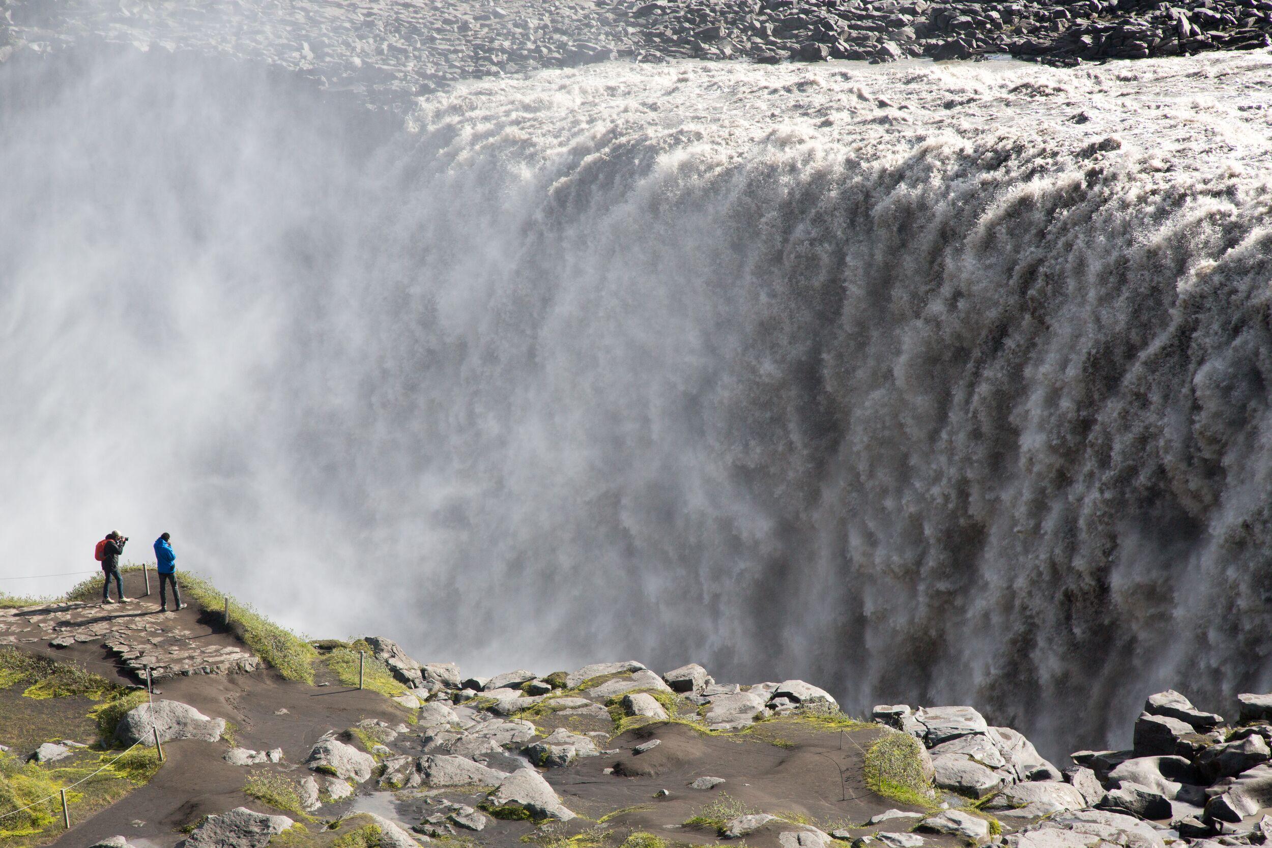 The waterfall is an impressive 100 meters wide and has a drop of 45 meters into the rugged Jökulsárgljúfur canyon. Its powerful stream originates from the mighty Vatnajökull glacier, the largest glacier in Europe. The strength of the falls is so enormous that the ground around it vibrates, and the plume of spray can be seen from miles away.
