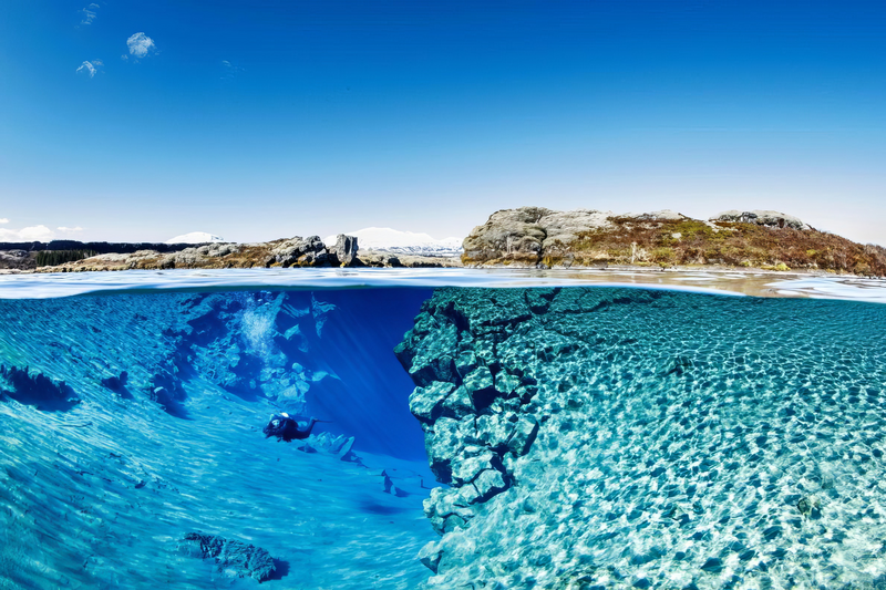 Silfra is a breathtaking fissure between the North American and Eurasian continental plates. Constantly filled with glacial water that has been filtering through underground lava rock for over 30 years, Silfra boasts some of the clearest water on Earth, offering an extraordinary visibility of over 100 meters.